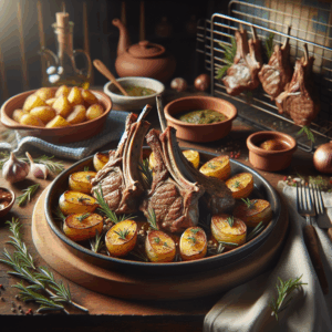 Título: Chuletillas de Cordero al Romero con Patatas Panaderas 🍽️ Ingredientes Cantidad Ingrediente 8 Chuletillas de cordero 2 Patatas grandes 1 Cebolla 3 Dientes de ajo 2 ramas Romero fresco 1/2 taza Aceite de oliva virgen extra Al gusto Sal y pimienta 👨🍳 Instrucciones Pela las patatas y córtalas en rodajas finas. Haz lo mismo con la cebolla. Precalienta el horno a 180°C. Engrasa una bandeja para horno con un poco de aceite de oliva. Coloca una capa de patatas en la bandeja, sazonándolas con sal y pimienta. Añade encima una capa de cebolla y los dientes de ajo picados.