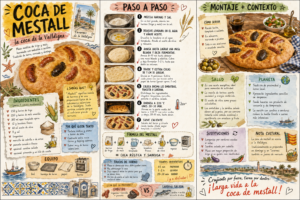 La coca de mestall es mucho más que una simple masa horneada; es un símbolo de identidad de la Safor, especialmente en municipios como Tavernes de la Valldigna y Oliva. Su nombre, que proviene del latín, significa literalmente «mezcla de harinas», haciendo referencia a su base única de trigo y dacsa (maíz). Si buscas recrear en casa este ritual gastronómico y disfrutar de la textura y el sabor que durante generaciones se ha compartido en los hornos de la zona, aquí tienes la receta paso a paso. Ingredientes necesarios Esta receta es sencilla pero requiere ingredientes de calidad para lograr