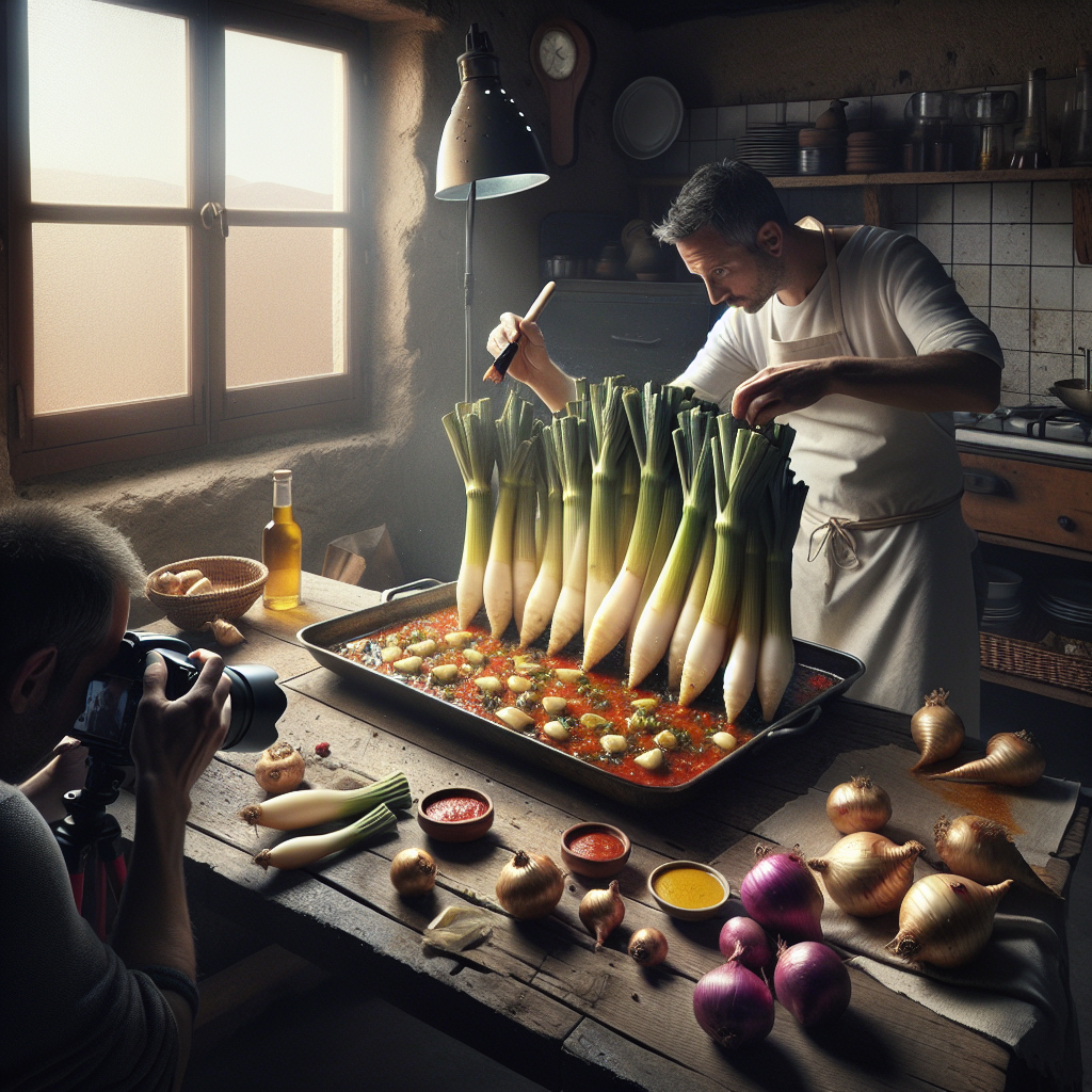 - Mientras los calçots se asan, prepara la salsa romesco. Asa los tomates y la cabeza de ajo en una sartén o al horno hasta que la piel se ennegrezca.