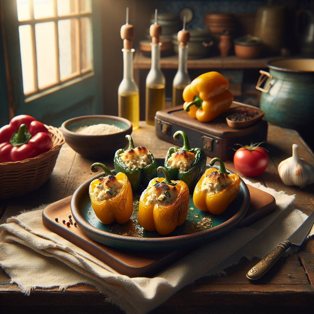 - Coloca los pimientos rellenos en una fuente de horno y vierte la salsa por encima. Hornea a 180°C durante 15 minutos.
